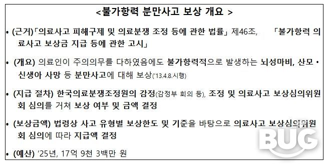 정부는 의료진이 최선을 다했음에도 불가항력적으로 발생한 분만사고에 대해 보상을 지원하고 있고, 올해 7월부터는 보상한도를 기존 3천만 원에서 최대 3억 원으로 상향했다. 또한 보상심의위원회의 전문성 강화를 위하여 보건복지부 장관이 위원회를 구성하고 전문가 위원을 보강하는 등 위원회 규정을 정비했다.