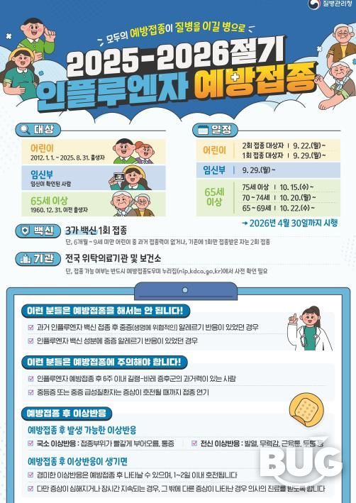 우선 22일 2회 접종 대상 어린이를 시작으로, ▲9월 29일, 어린이(1회 접종 대상)와 임신부 ▲10월 15일, 75세 이상 어르신 ▲10월 20일, 70~74세 어르신 ▲10월 22일, 65~69세 어르신의 접종이 이뤄지며, 모든 대상군 접종은 2026년 4월 30일까지 이어질 예정이다.