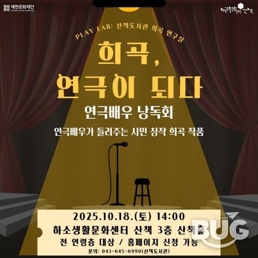 부울경문화뉴스 관리자 기자 | 제천문화재단(이사장 김상수)이'2025년 문학상주작가 지원사업'의 일환으로 상주작가와 마지막 문학프로그램인 '희곡, 연극이 되다' 연극배우 낭독회를 오는 18일 하소생활문화센터 산책에서 선보인다.