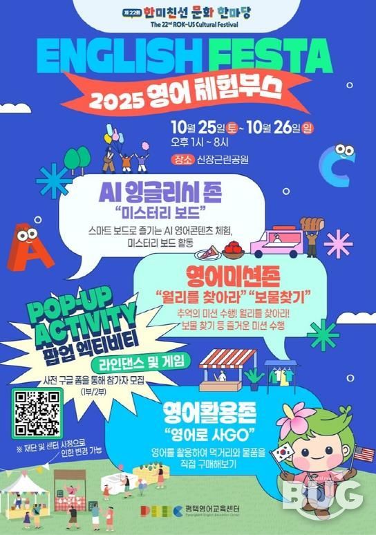 부울경문화뉴스 관리자 기자 | 평택시국제교류재단 평택영어교육센터는 오는 25일과 26일 양일간 평택 신장근린공원에서 열리는 ‘제22회 한미친선 문화한마당’에서 ‘English Festa Zone’을 운영한다. 이번 축제는 참가자들이 영어를 ‘학습’이 아닌 ‘체험’과 ‘놀이’로 즐길 수 있도록 다채롭고 흥미로운 프로그램이 운영될 예정이다.