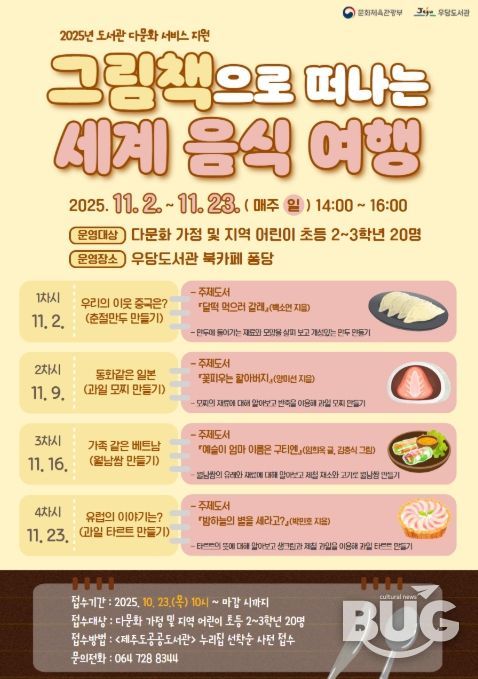 부울경문화뉴스 관리자 기자 | 제주시 우당도서관은 2025년 도서관 다문화 서비스 지원 사업인 ‘그림책으로 떠나는 세계 음식 여행’ 프로그램 참여자를 10월 23일부터 선착순 모집한다.