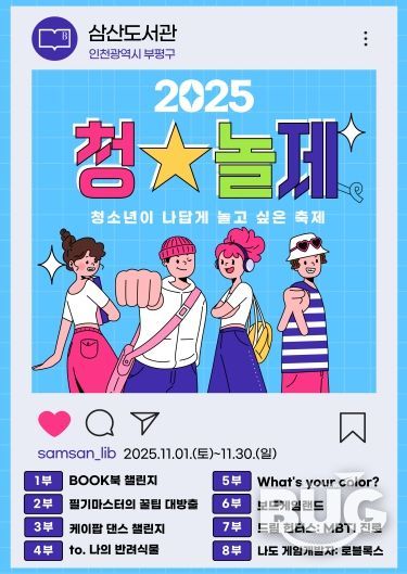 부울경문화뉴스 관리자 기자 | 부평구 구립 삼산도서관은 11월 한 달간 청소년(중학교 1학년~고등학교 3학년) 대상 문화체험 프로그램 ‘청★놀제: 청소년이 나답게 놀고 싶은 축제’를 운영한다.