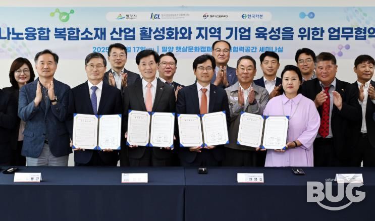 부울경문화뉴스 관리자 기자 | 경남 밀양시는 17일 햇살문화캠퍼스 소통협력공간 세미나실에서 한국건설생활환경시험연구원, (주)스페이스프로, (주)한국카본과 나노융합 복합소재 산업 활성화 및 지역기업 육성을 위한 업무협약을 체결했다고 밝혔다.