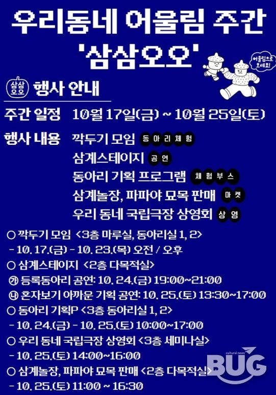 ‘삼계스테이지’는 무대 공연 프로그램으로 24일 저녁 ‘등록동아리 공연’과 25일 오후 ‘혼자 보기 아까운 기획 공연’이 운영된다. 통기타, 아코디언, 해금, 훌라댄스 등 다양한 무대 공연이 준비되어 있다. ‘삼계놀장’은 25일 오전과 오후 열리는 플리마켓으로 어울림 등록 동아리와 시민이 참여해 악세사리·가방·의류 등 직접 만든 수공예품과 중고 물품을 판매한다. ‘파파야 묘목 판매’는 어울림 주간 사전 프로그램으로 진행한 ‘못버려서 생긴 일 – 파파야 키우기’ 참가자들이 9월 한 달간 파파야 묘목을 재배해 판매하는 자리이다. 무용극 ‘호동’은 25일 오후 국립극장의 우수한 콘텐츠를 상영하는 행사이다.