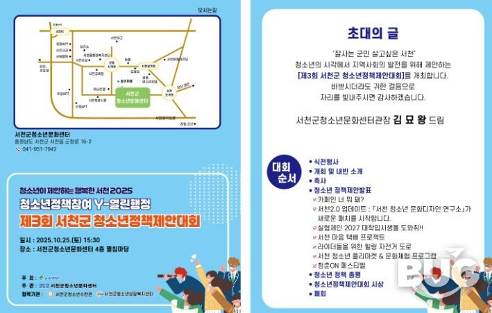 본 대회는‘행복한 서천’을 위해 지역의 청소년들이 학교, 환경, 복지, 진로, 관광 등을 주제로 조사·연구하여 제안한 정책들 가운데 본선에 진출한 7팀의 발표를 직접 들어볼 수 있는 뜻깊은 자리이다.