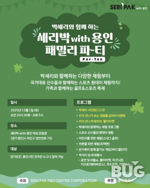 부울경문화뉴스 관리자 기자 | 용인특례시는 11월 1일 오전 10시 30분부터 오후 5시까지 처인구 경안천로 76에 위치한 ‘SERI PAK with 용인’ 야외운동장에서 골프 레전드 박세리 전 감독과 함께하는 ‘SERI PAK with 용인 패밀리 파티(Par-Tee)’를 개최한다고 21일 밝혔다.