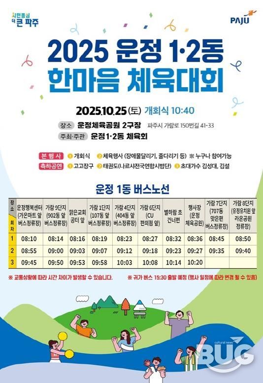 부울경문화뉴스 관리자 기자 | 운정1·2동 체육회는 오는 25일 운정체육공원(가람로 150번길 41-33)에서 ‘2025 운정1·2동 한마음 체육대회’를 개최한다고 밝혔다.
