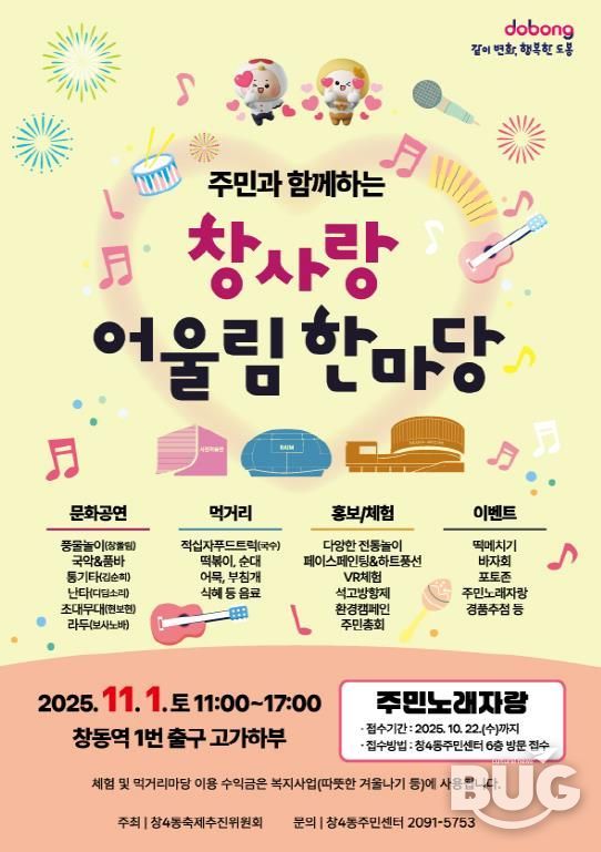 부울경문화뉴스 관리자 기자 | 서울 도봉구 창4동이 오는 11월 1일 오전 11시 창동역 1번출구 고가하부 일대에서 ‘창사랑 어울림 한마당’ 축제를 개최한다.
