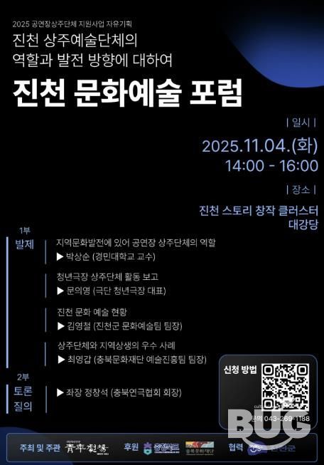 포럼은 오는 11월 4일 오후 2시 진천 K스토리창작클러스터 대강당에서 개최되며, 진천군민과 지역 문화예술에 관심 있는 누구나 참여할 수 있다.