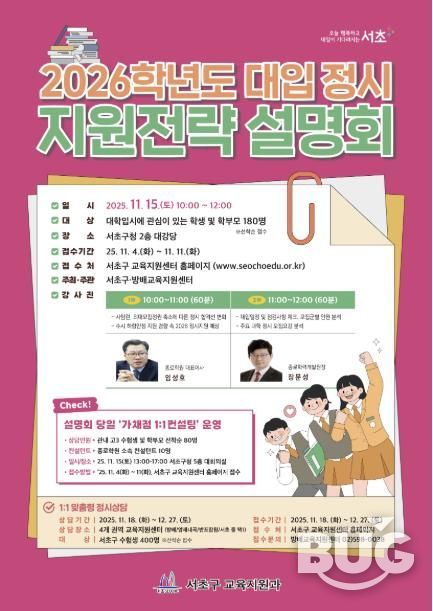 부울경문화뉴스 관리자 기자 | 서울 서초구가 수능 이틀 뒤인 11월 15일 오전 10시 서초구청 2층 대강당에서 수험생과 학부모를 위한 ‘2026학년도 대입 정시 지원전략 설명회’를 개최한다고 밝혔다.