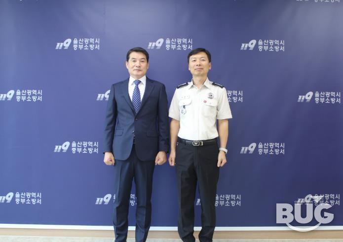 한 교육장은 유대선 울산 중부소방서장과 환담을 나누고 학교 안전 강화를 위한 유기적 협력체계를 논의하며 교육청과 소방서 간 협력 과제를 구체적으로 모색했다.