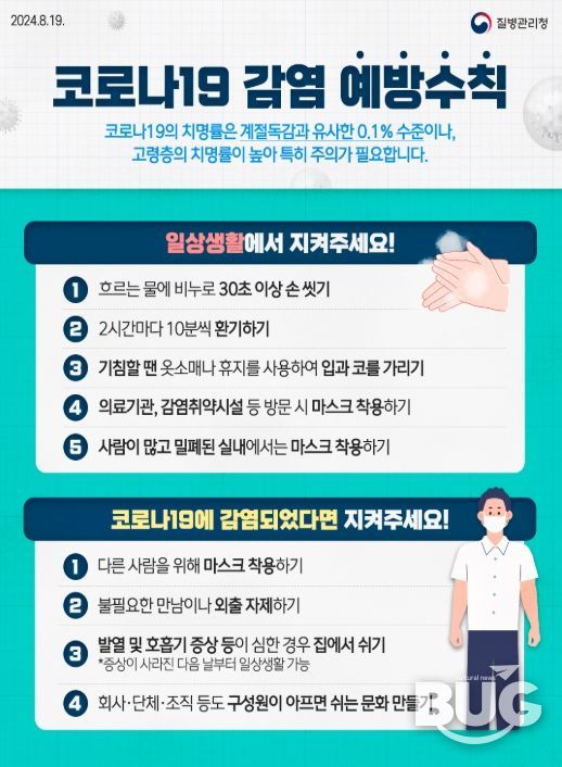 임승관 질병관리청장은 “9월에도 코로나19 확산세가 지속되는 상황으로, 국민께서는 환절기 코로나19 감염 예방을 위해, 일상 속에서 호흡기감염병 예방수칙을 생활화 하여 기억하고, 꼭 실천해달라”며, “특히, 어르신 등 고위험군은 사람이 많이 모이는 실내 행사 참여를 자제해 주시고, 참여 시에는 마스크를 착용해 주시길 바란다.”고 당부했다.