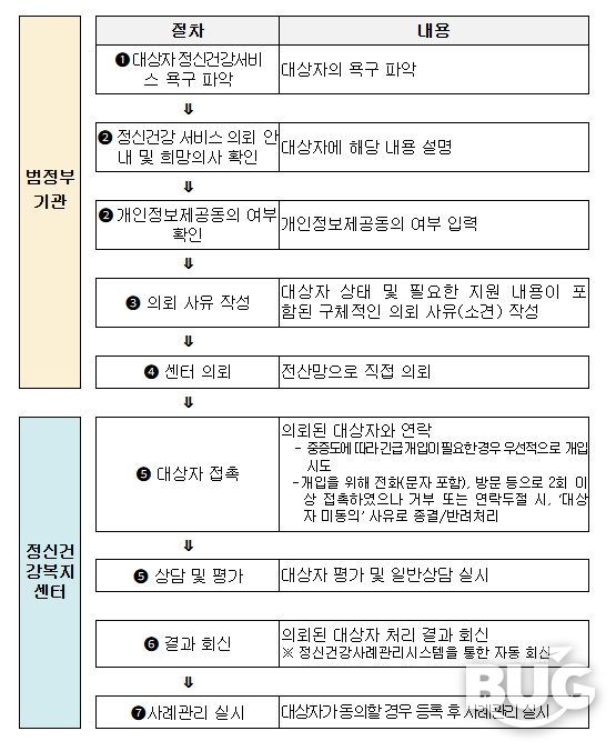 ‘범정부 서비스 의뢰’는 사회보장정보시스템을 기반으로 부처·지자체·민간시설 간 복지서비스를 상호 의뢰할 수 있는 체계다. 정신건강복지센터는 2024년 11월 병무청을 시작으로 서민금융진흥원, 신용회복위원회 등과의 연계를 확대해 왔다.