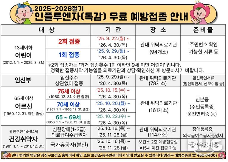 부울경문화뉴스 관리자 기자 | 광진구는 겨울철 호흡기 감염병 확산을 예방하고 구민 건강을 보호하기 위해 인플루엔자 무료 예방접종을 실시한다.