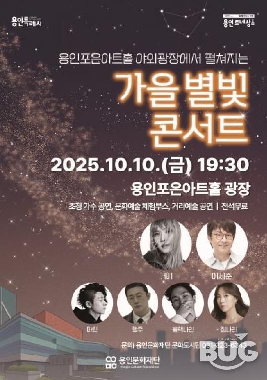 용인문화재단 관계자는 “이번 ‘가을 별빛 콘서트’는 새롭게 조성된 야외광장에서 열리는 첫 대규모 공연으로, 시민들에게 열린 광장형 축제의 장을 제공하게 될 것”이라며 “많은 시민이 함께해 별빛 가득한 가을밤의 낭만을 즐기길 바란다.”고 말했다.