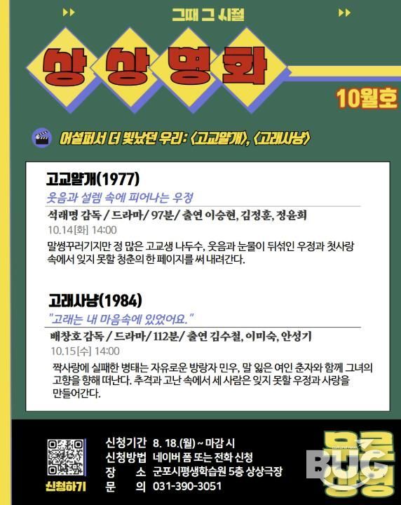 부울경문화뉴스 관리자 기자 | 군포문화재단 군포시평생학습원은 시민들의 문화 향유와 세대 공감을 위해 오는 10월 14일과 15일 상상극장에서 고전 영화 상영 프로그램 〈상상명화〉를 운영한다. 이번 상영작은 ‘고교얄개’와 ‘고래사냥’으로 무료 상영된다.