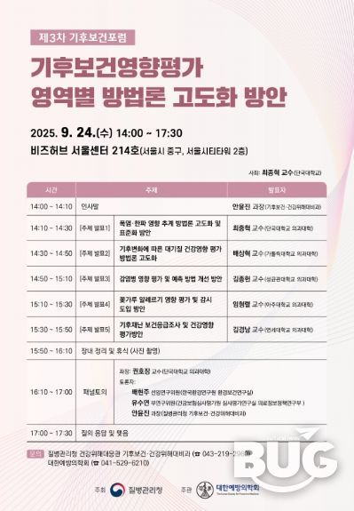 부울경문화뉴스 관리자 기자 | 질병관리청은 대한예방의학회(회장 홍영습)와 함께 '3차 기후보건포럼'을 9월 24일 오후 2시, 비즈허브 서울센터(서울시 중구 소재)에서 개최한다.