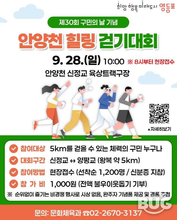 대회는 아름다운 수변 경치를 자랑하는 안양천 보행로에서 진행되며, 참가자들이 자연 속에서 가을볕과 바람을 만끽하며 힐링할 수 있는 재충전의 시간을 누릴 것으로 구는 기대하고 있다.