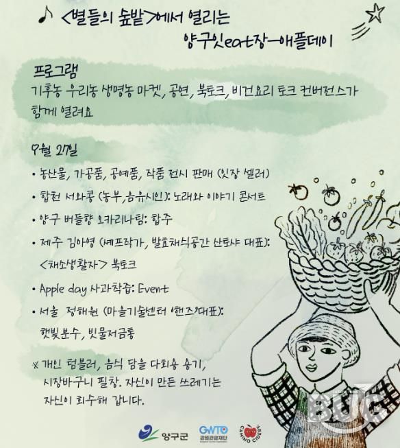 첫날인 27일에는 △양구 햇사과 착즙 시연 △소농들이 직접 운영하는 못난이 농산물 장터 △오카리나 공연 △이야기 콘서트 △태양 관측 필름 만들기 체험 등이 진행된다. 또한 커피와 빵을 비롯해 농산물·가공품, 공예품까지 다양한 상품을 만날 수 있는 마켓도 운영된다.