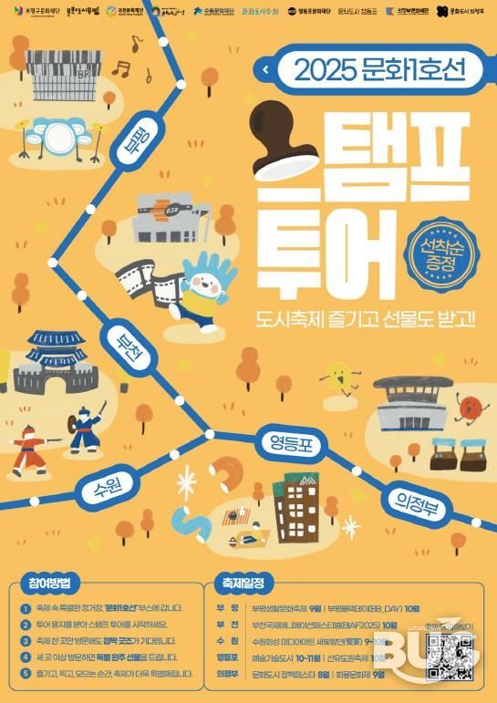 부울경문화뉴스 관리자 기자 | 수원문화재단은 수도권 1호선 라인을 따라 펼쳐지는 특별한 문화여행,‘문화 1호선 스탬프 투어’를 오는 9월부터 11월까지 부평, 부천, 영등포, 수원, 의정부 5개 법정문화도시 축제 현장에서 운영한다고 밝혔다.