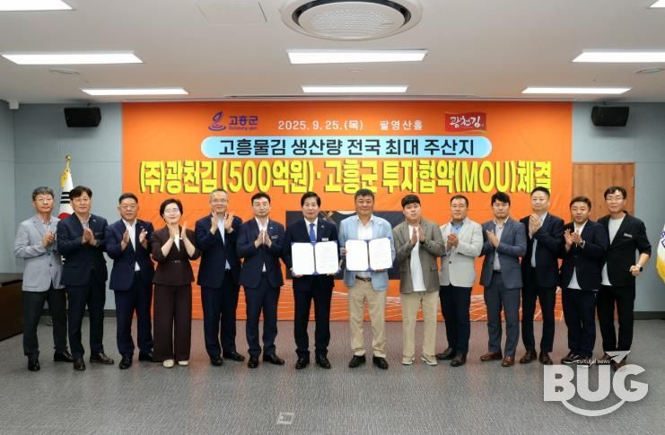 부울경문화뉴스 관리자 기자 | 고흥군은 지난 25일 군청 팔영산홀에서 국내 김 산업 선도기업인 ㈜광천김과 500억 원 규모의 민간개발 투자협약(MOU)을 체결했다고 밝혔다.