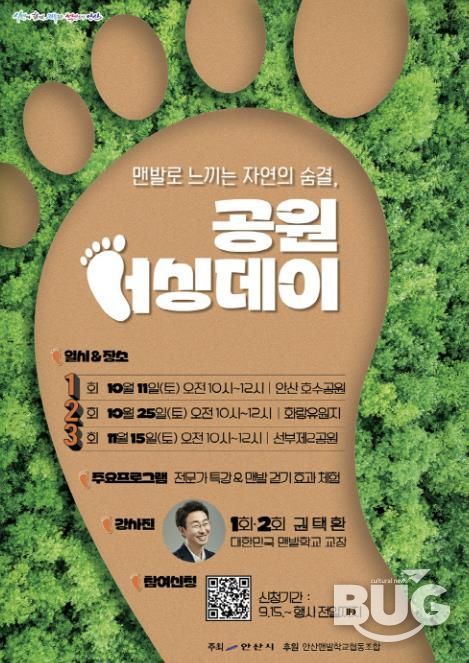 시민 참여형 자연 치유 행사인 ‘공원 어싱데이’는 자연의 에너지를 맨발로 직접 느끼며 몸과 마음의 건강을 회복할 수 있도록 10월 11일 호수공원, 10월 25일 화랑유원지, 11월 15일에는 선부제2공원에서 순차 진행된다.