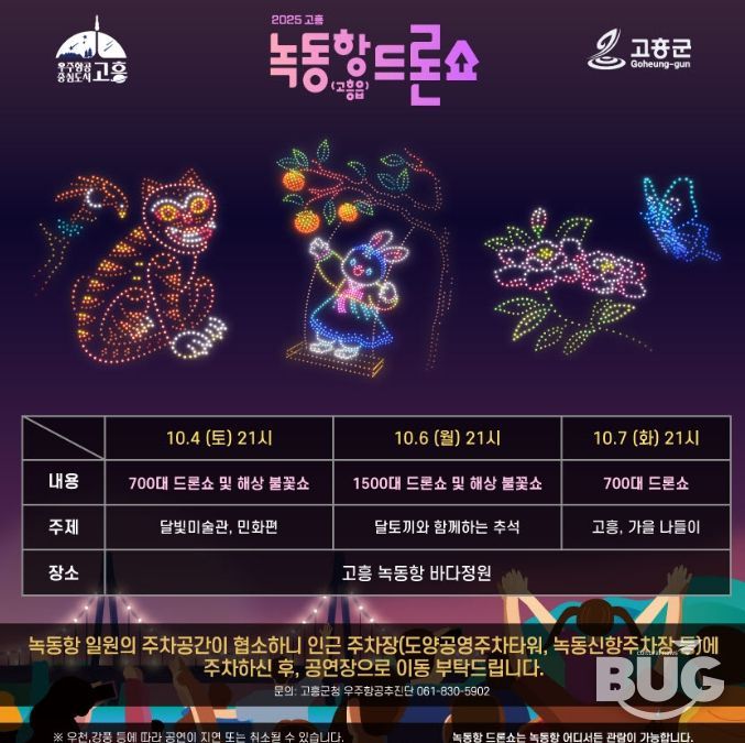 고흥군 녹동항 드론쇼는 오는 10월 25일 폐막식을 앞두고 있으며 강우, 강풍 등 기상 여건에 따라 일정이 변경될 수 있다.