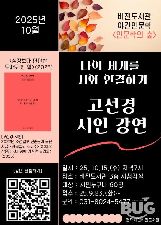 부울경문화뉴스 관리자 기자 | 평택시 비전도서관은 오는 10월 15일 저녁 7시 '심장보다 단단한 토마토 한 알'의 고선경 시인을 초청하여 ‘나의 세계를 시와 연결하기’를 주제로 야간 인문학 강연을 진행한다.