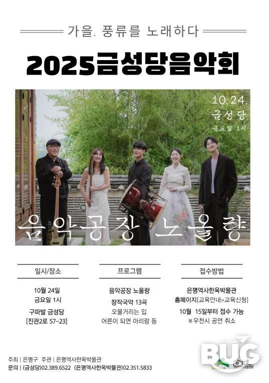 부울경문화뉴스 관리자 기자 | 서울 은평구는 10월 24일 오후 1시 은평뉴타운 아파트 숲 사이에 자리한 금성당에서 ‘음악회’를 개최한다고 밝혔다.