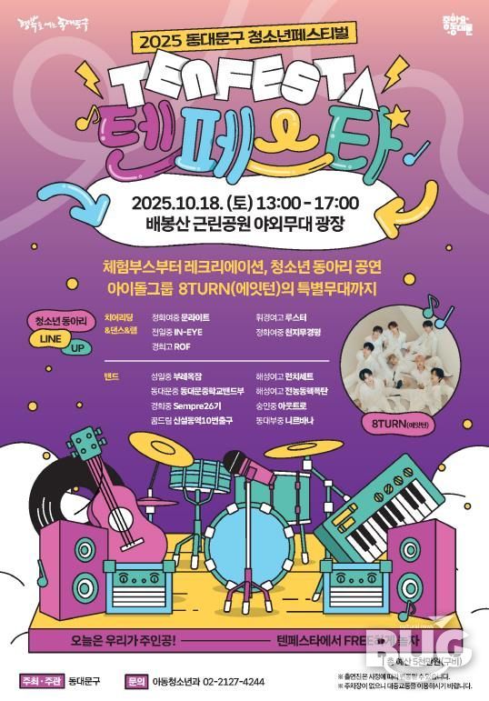부울경문화뉴스 관리자 기자 | 서울 동대문구는 오는 18일 오후 1시부터 5시까지 배봉산근린공원 열린광장에서'2025 동대문구 청소년 페스티벌 ‘텐 페스타(TEN FESTA)’'를 개최한다고 밝혔다.