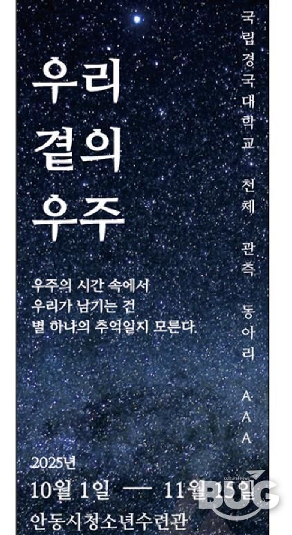 부울경문화뉴스 관리자 기자 | 안동시시설관리공단이 운영하는 안동시청소년수련관은 10월 1일부터 11월 15일까지 청소년수련관 1층 꿈꾸는 미술관에서 '우리 곁의 우주展'을 개최한다고 밝혔다.
