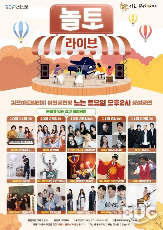 부울경문화뉴스 관리자 기자 | (재)김포문화재단은 10월 11일부터 11월 22일까지 매월 둘째, 넷째 주 토요일마다 김포아트빌리지 야외공연장에서 하반기 토요상설공연 '놀토 라이브'를 개최한다고 밝혔다.