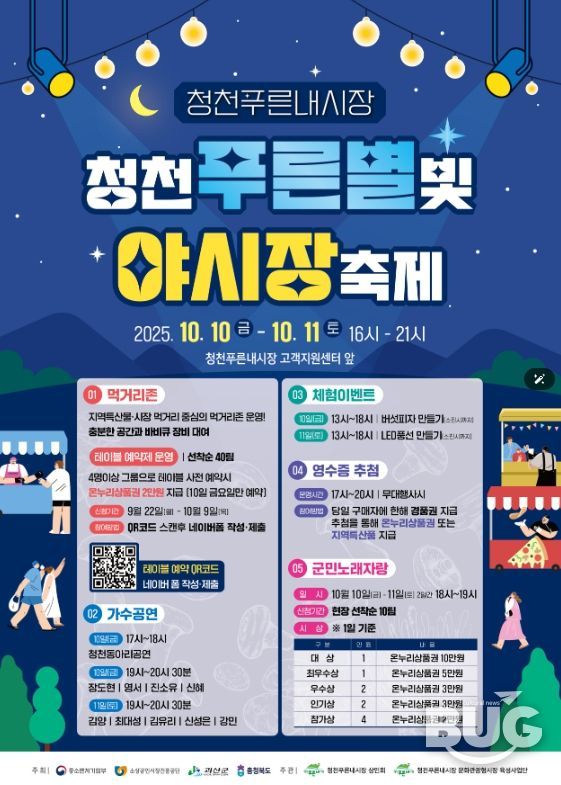 청천푸른내시장 관계자는 “청명한 가을밤에 가족과 친구들이 함께 맛과 멋, 즐거움을 모두 누릴 수 있는 자리가 될 것”이라며 “지역 전통시장에 활기를 불어넣는 뜻깊은 시간이 되길 바란다”고 말했다.