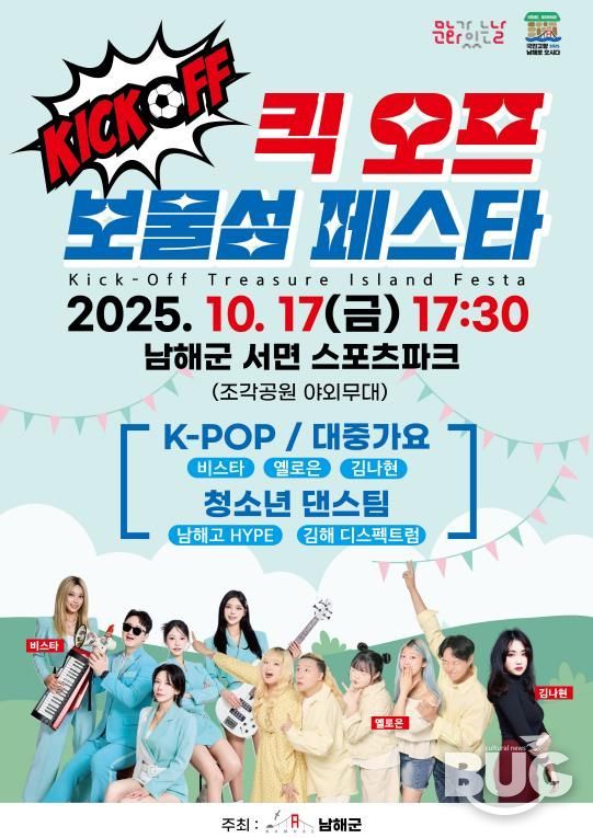 김지영 남해군 문화체육과장은 “킥 오프! 보물섬 페스타는 군민 모두가 즐길 수 있는 청춘·열정·화합의 무대가 될 것”이라며, “음악과 춤이 어우러진 공연을 통해 세대 간 공감과 소통의 장을 만들 것으로 기대되니 많은 분들이 함께해 주시면 좋겠다”고 밝혔다.