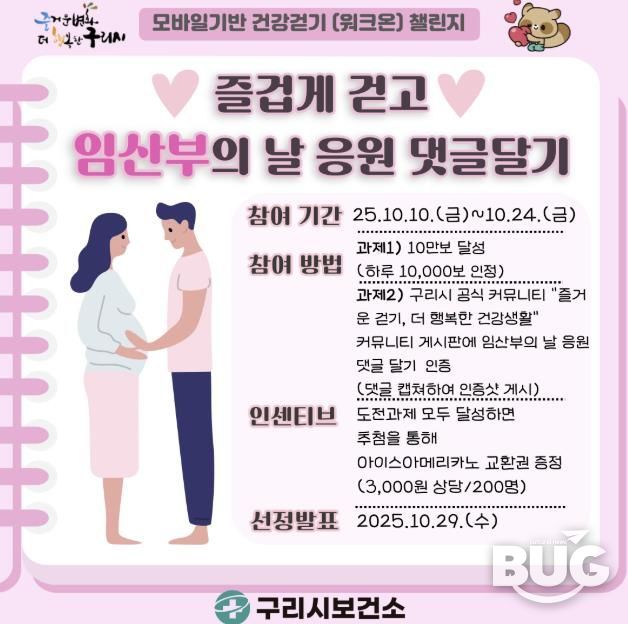 부울경문화뉴스 관리자 기자 | 구리시는 제20회‘임산부의 날’(10월 10일)을 기념해 임신과 출산의 가치를 되새기고 시민 건강 증진을 도모하기 위한 ‘즐겁게 걷고, 임산부의 날 응원 댓글 달기’ 챌린지를 오는 10월 10일부터 24일까지 15일간 운영한다고 밝혔다.