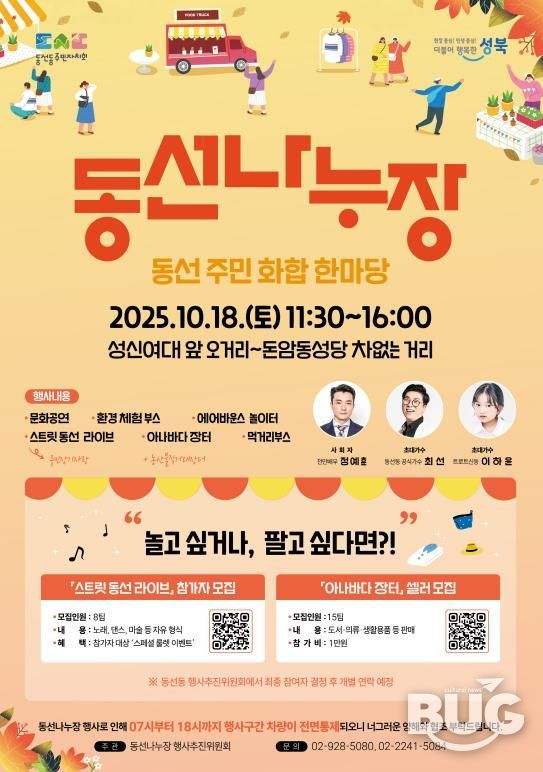 부울경문화뉴스 관리자 기자 | 서울 성북구가 오는 10월 18일 오전 11시 30분부터 오후 4시까지 성신여대 앞 오거리에서 돈암동성당 구간까지 이어지는 도로에서 ‘2025년 차 없는 거리 동선나누장’을 개최한다.