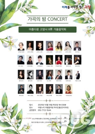 부울경문화뉴스 관리자 기자 | 고양특례시가 후원하고, (사)한국예술문화단체총연합회 고양지회가 주최하며 (사)한국음악협회 고양지부가 주관하는 ‘2025 가곡의 밤 – 아름다운 고양시 8경(景) 가을 음악회’가 오는 16일 오후 7시 30분, 고양아람누리 아람음악당에서 개최된다.