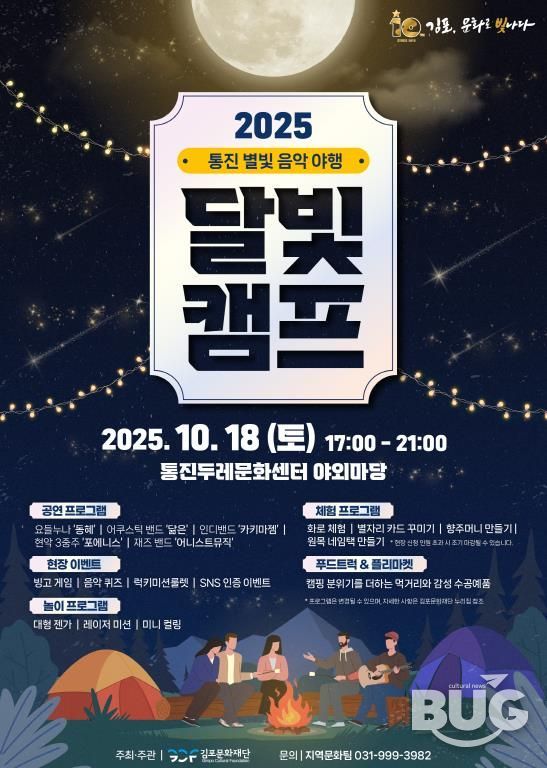 부울경문화뉴스 관리자 기자 | (재)김포문화재단이 주관하는 2025 통진별빛음악야행 '달빛캠프'가 10월 18일 17시부터 통진두레문화센터 야외마당에서 개최된다.