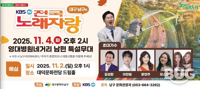 부울경문화뉴스 관리자 기자 | 대구 남구는 국내 최장수 인기 프로그램인 KBS 전국 노래자랑 ‘대구 남구편’이 오는 11월 4일 오후 2시, 영대병원네거리 남편 특설무대에서 열린다고 밝혔다.