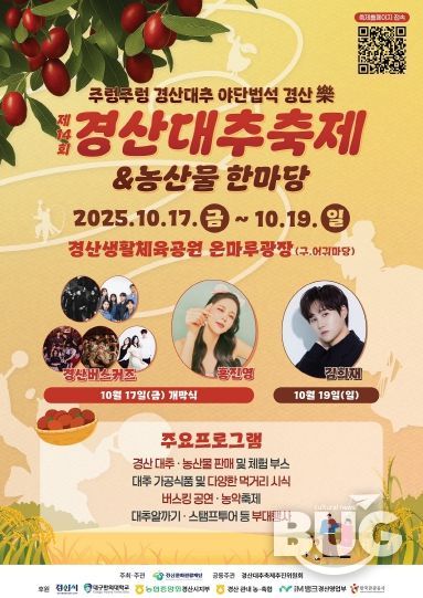 (재)경산문화관광재단 조현일 이사장은 “이번 축제는 풍요와 풍년을 상징하는 대추를 통해 경산의 넉넉한 마음과 활기찬 에너지를 나누자는 뜻을 담고 있다”며 “조선시대 ‘왕실진상품’으로서의 명성을 이어, 품질과 우수성이 뛰어난 경산 대추의 가치를 널리 알리고 농업인·시민·방문객 모두가 함께 풍년의 기쁨을 나누는 대동의 한마당이 되길 바란다”고 밝혔다.