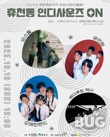 또한 10월 19일(일)에는 STAXX(영주시 대학로86번길 14)에서 ‘휴천동 인디사운즈 on’이 개최된다. 영주와 외부 청년 아티스트들이 함께하는 로컬 뮤직 페스티벌로, 오예린밴드, 모스힐, 베이루트 택시, 유인원 등이 출연해 청춘의 열기를 음악으로 전한다.