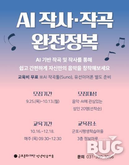부울경문화뉴스 관리자 기자 | 군포시평생학습마을이 4차 산업혁명 시대의 핵심 기술인 인공지능(AI)을 활용한 예술 창작교육을 선보인다. 오는 10월 16일부터 12월 18일까지 매주 목요일 진행되는 'AI 작사·작곡 완전정복' 강좌는 시민이 디지털 기술을 활용해 직접 노래를 만들고, 음악을 통해 창의력을 확장할 수 있도록 기획됐다.