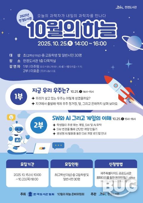 부울경문화뉴스 관리자 기자 | 제주시 한경도서관은 한국도서관협회와 10월의 하늘 준비위원회가 공동 주최하는 ‘10월의 하늘: 과학자들의 재능기부 도서관 과학 강연’ 공모에 선정돼 오는 10월 25일 다목적실에서 강연을 개최한다.