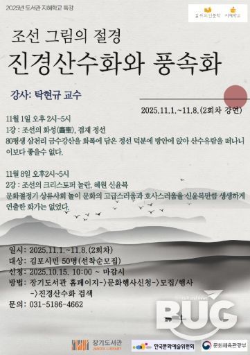 부울경문화뉴스 관리자 기자 | 김포시 장기도서관은 2025년 도서관 지혜학교 특강으로 '조선 그림의 절경 진경산수화와 풍속화'를 오는 11월 1일, 11월 8일 오후 2시부터 5시까지 장기도서관 대강당에서 운영한다고 밝혔다