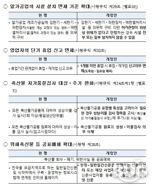 주요 내용은 ①알가공업 시설기준 완화, ②영업자의 단기 휴업신고 면제, ③축산물가공품 자가품질검사 대상·주기 완화, ④위해 축산물 등 공표 매체 확대 등이다.