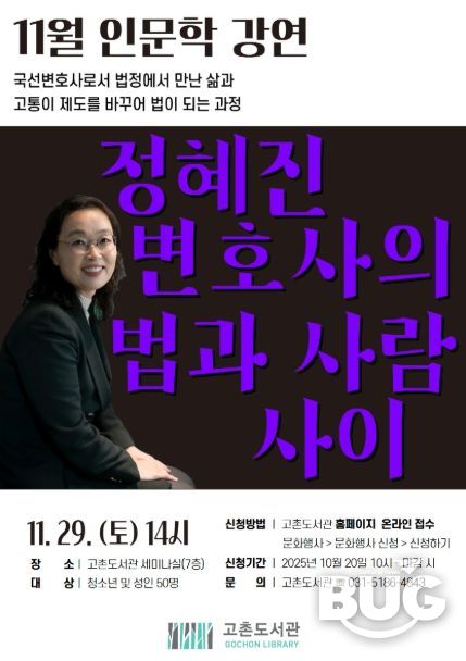 부울경문화뉴스 관리자 기자 | 김포시 고촌도서관은 오는 11월 29일 오후 2시부터 4시까지 '법과 사람 사이' 강연을 운영한다.
