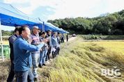 부울경문화뉴스 관리자 기자 | 무주군이 벼 작목의 경쟁력 강화를 위해 품종 다변화를 시도하고 있는 가운데 지난 15일에는 안성면 장기리 일원에서 ‘신동진1’ 생육평가회를 가졌다. 이날 평가회는 해당 품종의 생육 상태와 병해충 저항성, 품질 등을 종합적으로 관찰하고 ‘신동진’과 ‘참동진’ 등 다른 품종과의 비교를 통해 보급 확대 방안을 모색한다는 취지에서 마련된 것으로, 황인홍 무주군수를 비롯한 6개 읍·면 이장, 그리고 지역 내 벼 재배농가 등 60여 명이 참석해 ‘신동진1’의 주요 특성과 전시포 운영 현황을 공유하고 생육 상황을 직접 점검했다. 황인홍 무주군수는 “이 자리는 다수확 품종의 공공비축미 제외 정책에 따른 후속 품종의 보급이 절실한 상황에서 우리 지역에 적합한 벼 품종을 선정하고 재배 기술 공유, 생산성과 품질 개선, 기후변화 대응력을 강화한다는 측면에서 매우 중요한 의미가 있다”라며 “앞으로 벼 재배 안정화는 물론, 병해충 예찰과 방제, 재배 기술 교육 등 강화를 통해 경쟁력을 키워 나갈 것”이라고 밝혔다. ‘신동진1’은 ‘신동진’과 유전적으로 유사하나 품질이 강화된 신품