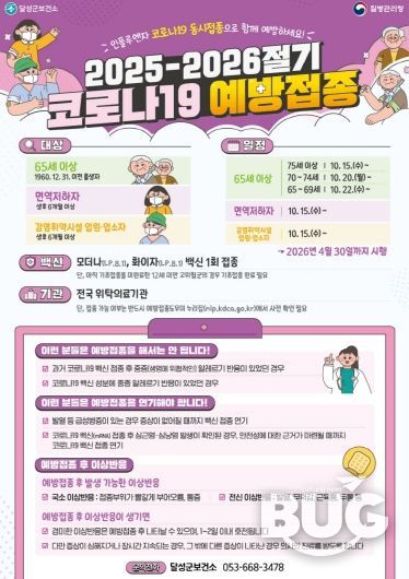 부울경문화뉴스 관리자 기자 | 달성군은 오는 10월 15일부터 2026년 4월 30일까지 ‘2025-2026절기 코로나19 예방접종’을 실시한다고 밝혔다.