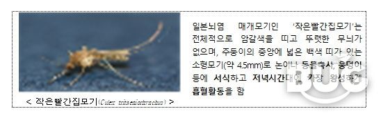 일본뇌염 매개모기인 작은빨간집모기는 암갈색 소형 모기로 주로 야간에 흡혈활동을 하고, 우리나라 전 지역에서 10월까지 활동하는 것으로 관찰된다. 일본뇌염 매개모기 감시 결과 9월말 기준(39주차) 평균 108개체로 지속적으로 발생하고 있으므로, 모기 물림에 주의하고, 증상 발현 시 신속하게 의료기관을 방문하여 진단 및 치료를 받아야 한다.