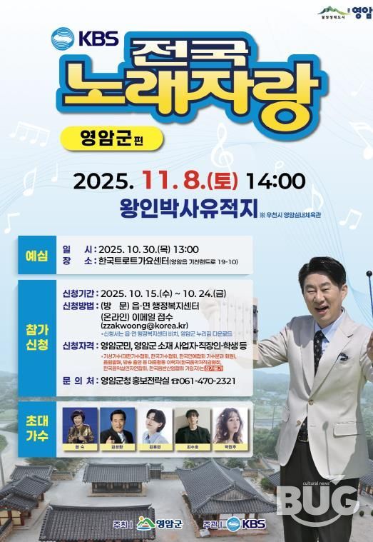 영암군 주최, KBS 주관으로 11/8일 오후 2시 왕인박사유적지에서 열리는 전국노래자랑에서 솜씨를 뽐낼 영암군민 등의 신청을 받는다.